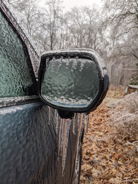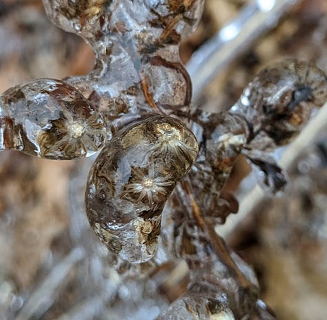 Looking out the window once more, I think about the ice storms that hit hard due to the north slope microclimate in which I live. My world is encased in ice during a storm, turning my backyard into a glittering ice palace with every blade of grass, every twig on the trees, every pod of a dormant milkweed plant thickly glazed. The icy back steps are treacherous, locking me in the house. My car doors are sealed tight with ice, undrivable until the thaw comes. Everything stops in this frozen world.